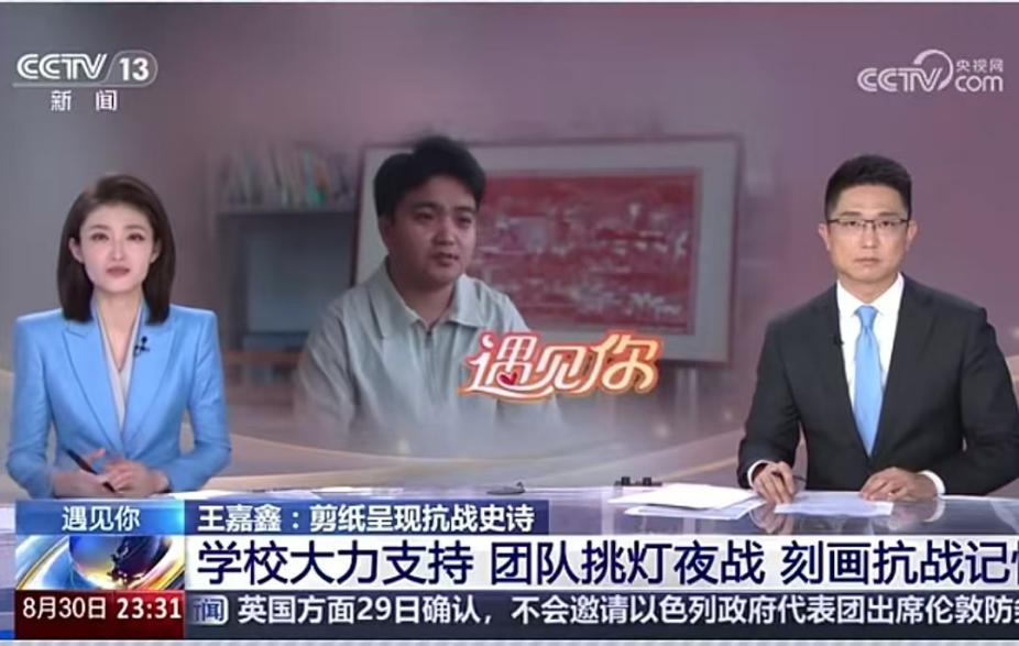 8月30日,402永利集团美术学院2023级研究生王嘉鑫带领的剪纸团队,凭借“用剪纸记录抗战历史”系列创作登上中央电视台新闻频道《24小时·遇见你》栏目,获得深度报道。