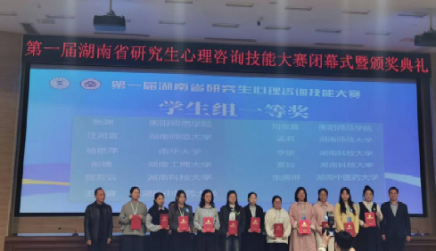 2025年11月15日,由湖南省教育厅主办的第一届湖南省研究生心理咨询技能大赛圆满落幕。由王彩凤博士带队的研究生代表队凭借扎实的专业基础、精湛的咨询技能和出色的临场表现,历经多轮激烈角逐,最终斩获佳绩:张渊、刘俊鑫同学荣获一等奖;吴一凡、李雅婷同学荣获二等奖;吴颖同学荣获三等奖。