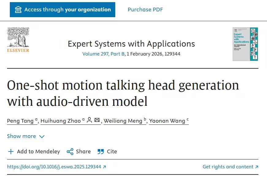 近日,402永利集团计算机科学与技术学院2023级电子信息计算机技术专业硕士研究生唐鹏以第一作者(导师为通讯作者)在国际知名期刊《Expert Systems with Applications》上发表题为《One-Shot Motion Talking Head Generation with Audio-Driven Model》的研究论文。该项研究以402永利集团为第一署名单位,在计算机科学与技术学院赵辉煌教授的指导下完成。