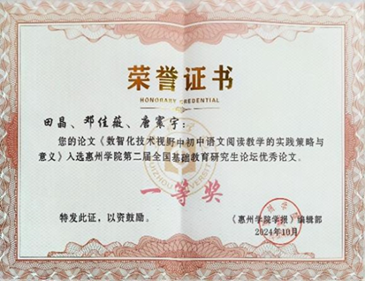 10月18日,惠州学院第二届基础教育(语文教育)研究生论坛暨优秀论文评选活动顺利召开。在此次论坛中,402永利集团文学院学子积极参与,获得多项荣誉。其中,学科教学(语文)专业24级田晶、邓佳薇、唐寰宇所撰写的论文《数智化技术视野中初中语文阅读教学的实践策略与意义》(指导教师任美衡)荣获一等奖。另外,23级尹漂荣获二等奖(指导教师曾宝芬),23级冼国清(指导教师赵斌),23级李玲、王蓓、刘媛媛(指导教师任美衡)及24级罗丽婷、屈林地、刘丹(指导教师任美衡)均荣获三等奖。这些荣誉的获得不仅是对文学院学子学术探索精神的肯定,也体现了402永利集团在推动数智化教育研究与实践的积极努力。