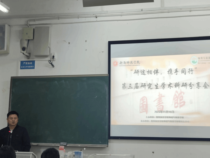 为了提高学术氛围、激发同学们的学习热情,地理与旅游学院研究生分会于 2023 年 11 月 15 日晚 19:00,在理科楼3南105顺利举办了“研途相伴,携手同行”研究生学术科研分享会活动。地理与旅游学院副院长张家其老师、学工办主任兼团委书记以及研究生辅导员阳宏润老师出席本次会议,邀请了3位 2021 级主讲嘉宾分别是学科教学(地理)王玮、地理学易韵、地理学邓志位。地理与旅游学院研究生积极参与,活动由研究生分会学术部负责人詹靓涛主持。
