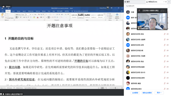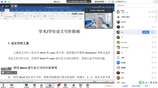 龚教授首先从如何开题,如何确定选题,如何撰写国内外研究现状,如何分析现有方法的不足之处,如何确认研究内容、拟解决关键问题和技术路线,以及研究基础和可行性分析六个方面进行了详细的分析和介绍。同时,从介绍学术/学位论文写作指南的角度,对论文写作的主要工具word和Latex的使用技巧进行了详细的讲解。最后,龚教授向与会人员分享了团队的研究历程与最新进展,介绍了自己及团队成员在研究过程中,从论文的撰写、修改、投稿、返修到录用的细节及心历路程。