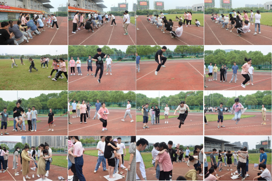 活动分为拔河、绑脚跑、跳长绳、我的地盘我做主四个项目。赛前热身后,大家纷纷投入各个项目的比赛。在拔河比赛中,两队队员身体后仰,重心下移,紧握长绳,使出浑身力气,拼命地往自己的方向拉。在两队队员的激烈争夺下,系在绳子中间的灰布,一会向这边移动,一会又向那边移动。场上队员齐心协力,奋力拼搏。场下的同学们也群情激昂,加油声、呐喊声此起彼伏,全场气氛被彻底点燃;在绑脚跑比赛中,同学们将腿绑在一起,手挽手,步调一致,团结协作,在响亮口号的引领下,一起向着目标奋力前进。有的队伍配合默契、健步如飞,很快到达终点,有的队伍步子乱了,调整好后继续前行,大家用行动证明了团结的力量;在跳长绳比赛中,选手们手中的跳绳飞快甩动,灵活地身姿成为了场地上靓丽的风景;在我的地盘我做主比赛中,为了使队伍着地的面积最小,各队可谓是各显神通,有的每名队员只站一只脚,有的直接一个人成了两个队员的依靠,引起现场参与者的阵阵欢呼。